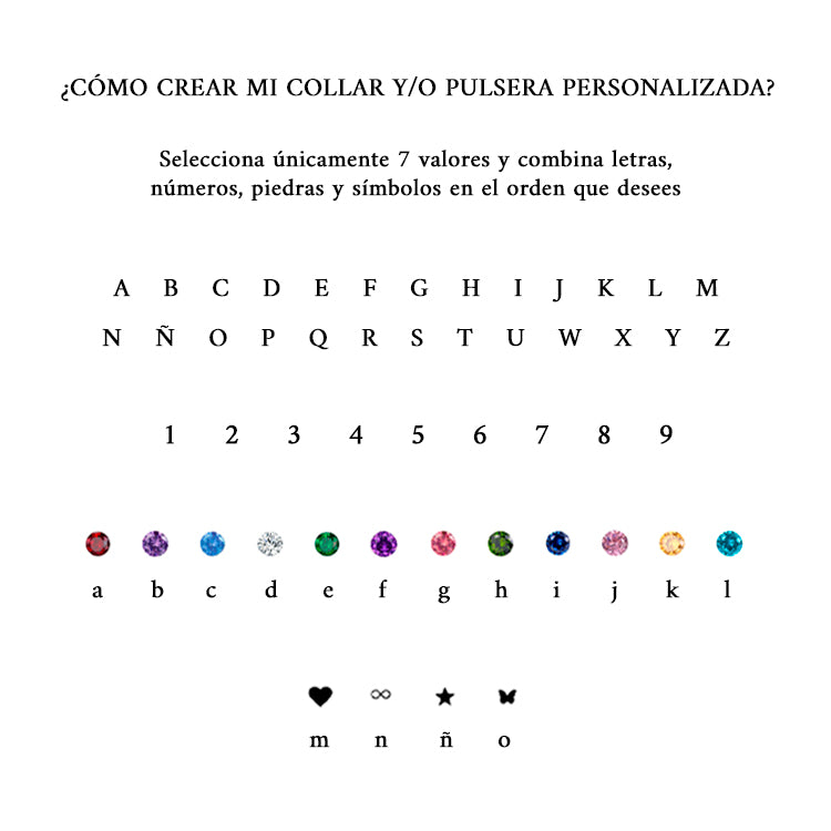Cada detalle ha sido cuidadosamente elaborado para representar lo que más amas. Personaliza tu joya con hasta 7 letras y piedras preciosas correspondientes a los meses de nacimiento, creando un colgante o pulsera que cuenta tu historia de una manera única y especial.