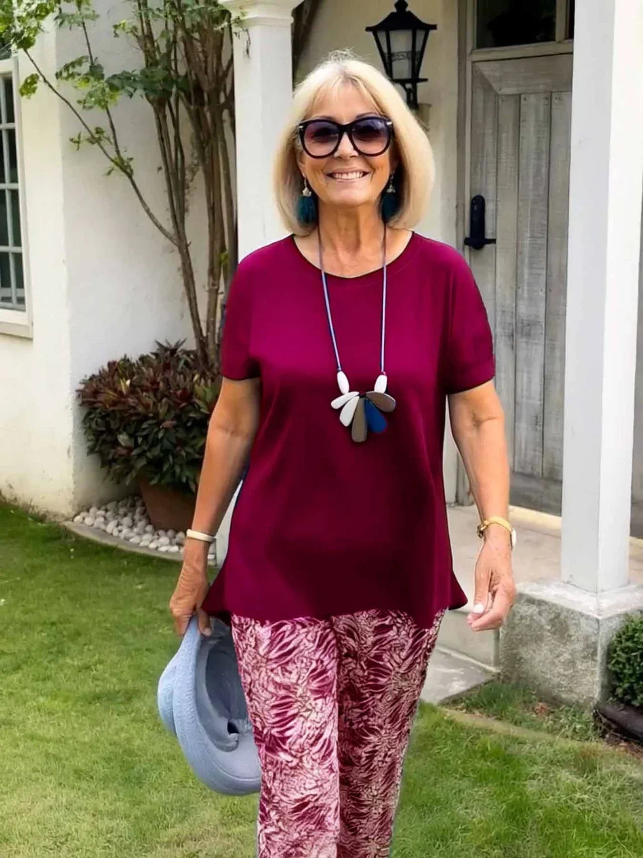 Elegancia Atemporal: La combinación del top entallado con un pantalón estampado crea un look sofisticado pero relajado.